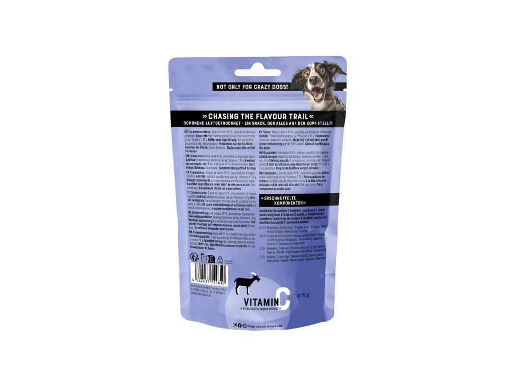Plátky vzduchem sušeného masa s extra vitamínem C představují přírodní pochoutku pro psy všech věkových kategorií a velikostí, od štěňat až po seniory. Obsahují 95 % kozího masa a díky monoproteinovému složení jsou vhodné i pro psy s potravinovými alergiemi. Maso je šetrně sušené vzduchem, aby si zachovalo svou přirozenou chuť a živiny, a díky tomu je křehké a snadno se porcuje.