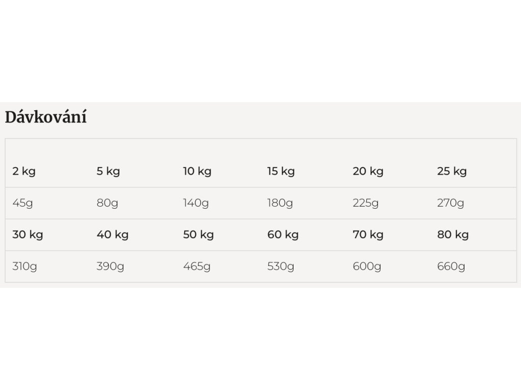 Hrubý protein 31 %, hrubý tuk 16 %, popelovina 8,5 %, vláknina 3,5 %, vlhkost 8,5 %, omega-6 kyseliny 2,8 %, omega-3 kyseliny 1,6 %, vápník 1,6 %, fosfor 1,3 %, glukosamin 0,09 %, chondroitin 0,07 %, energetická hodnota 3700 kcal/kg.