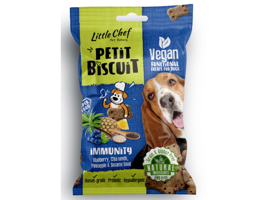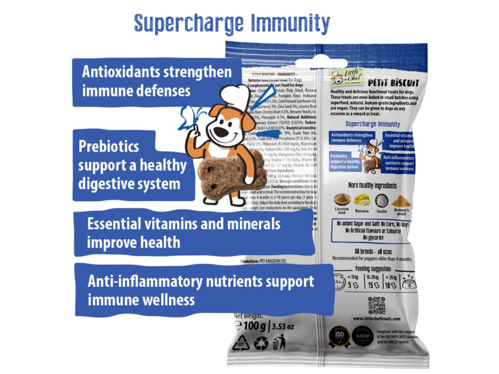 Petit Biscuit Immunity jsou funkční pamlsky pečené v malých dávkách z veganských surovin v potravinářské kvalitě. Jejich receptura s borůvkovou a ananasovou dření, chia semínky a sezamem byla navržena tak, aby přirozeně podpořila imunitní systém, celkovou vitalitu a odolnost organismu.